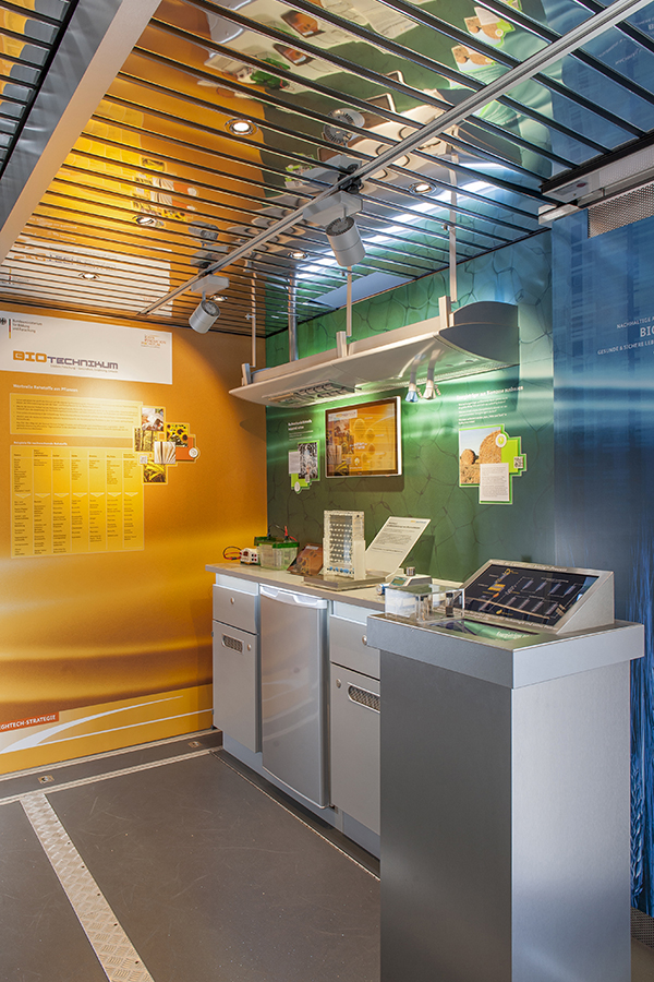 So wie Forschung, Entwicklung und Anwendung Stationen eines Prozesses sind, präsentiert auch das BIOTechnikum die Schlüsseltechnologie des 21. Jahrhunderts: Labor- und Ausstellungsbereich bilden – selbstverständlich unter Berücksichtigung relevanter Sicherheitsaspekte – räumlich integrierte Bestandteile einer Erlebniswelt. Wer beispielsweise in einem Praktikum biotechnologische Experimente durchführt, kann sich von seinem Laborarbeitsplatz aus mittels Themendisplays über verschiedene Facetten der Biotechnologie informieren und diese in Form von Exponaten teils interaktiv erfassen. Vertiefen, ergänzen und diskutieren lassen sich die hier gewonnenen Informationen und Eindrücke im multimedial ausgestatteten Obergeschoss. Denn gleich, für wen und mit welchem Veranstaltungsangebot sich die mobile Erlebnsiwelt BIOTechnikum öffnet – der Dialog steht im Mittelpunkt.