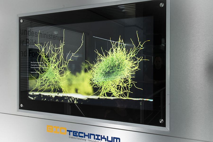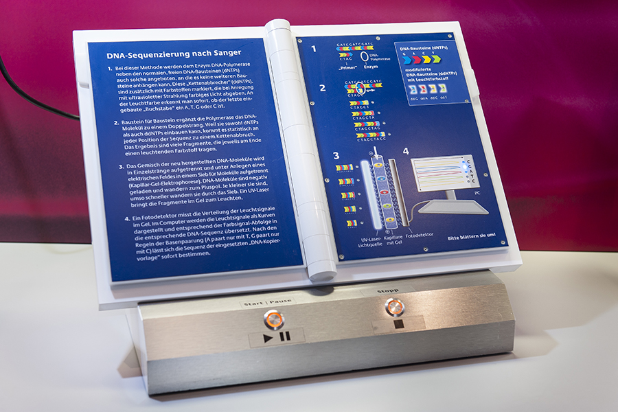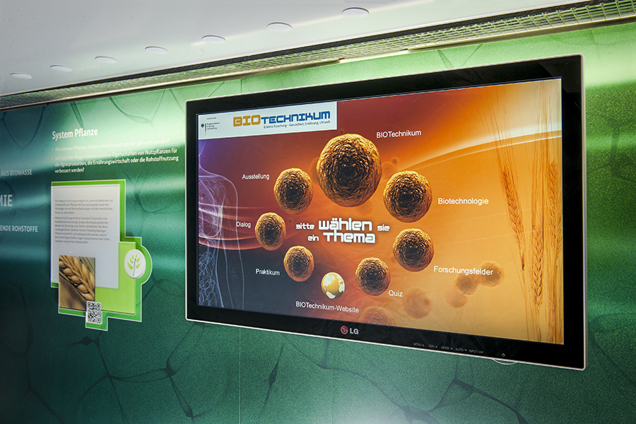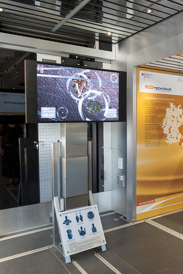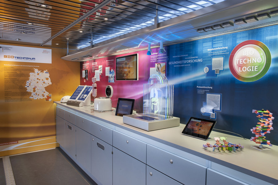 Möglich macht dies der abgestimmte Einsatz verschiedener Elemente. Themendisplays, Multimedia-Terminals und Exponate nehmen den Besucher mit in die Welt der Biotechnologie. Hier lässt sich „Wissenschaft zum Anfassen“ erleben und Biotechnologie, die Spaß macht: unter anderem mit dem Multimedia-Lernspiel „Bodymover“, den „Sprechenden Köpfen“ oder der Präsentation „Kunstwerke des Lebens“.