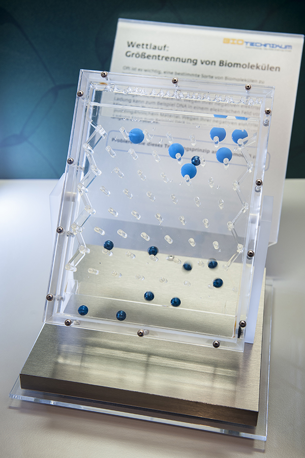 Bis zu 60 Personen können sich im Erdgeschoss des BIOTechnikums individuell eine der Schlüsseltechnologien des 21. Jahrhunderts erschließen. Im Mittelpunkt steht dabei der Zusammenhang von Forschung, Entwicklung und Anwendung. Wie weit sich die Besucher in die Biotechnologie vertiefen, entscheiden sie selbst, denn die Ausstellung präsentiert ihre Informationen in aufeinander aufbauenden Stufen. Sie bietet somit Interessantes und Neues für ein breites Publikum – vom Schüler bis zum mittelständischen Unternehmer.